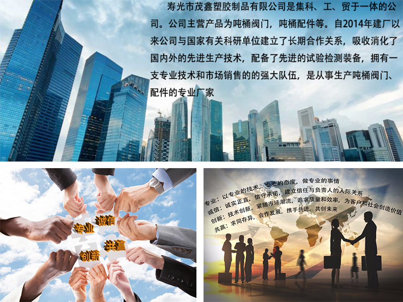 壽光市茂鑫塑膠制品有限公司是集科、工、貿(mào)于一體的公司。公司主營產(chǎn)品為噸桶閥門,噸桶配件等。自建廠以來公司與國家有關(guān)科研單位建立了長期合作關(guān)系,吸收消化了國內(nèi)外的生產(chǎn)技術(shù),配備了先進(jìn)的試驗(yàn)檢測裝備,擁有一支專業(yè)技術(shù)和市場銷售的的強(qiáng)大隊(duì)伍,是從事生產(chǎn)噸桶閥門、配件的專業(yè)廠家。